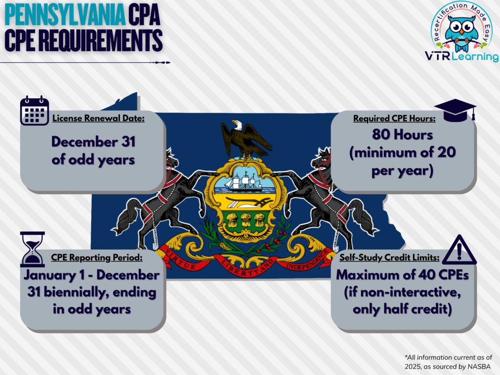Essentially, members living in Pennsylvania must renew their license every two years. And they need to complete at least 20 hours of CPE each year. However, for the overall requirement, they must complete 80 hours of CPE. The chart below offers further details on the requirements for licensees in Pennsylvania.